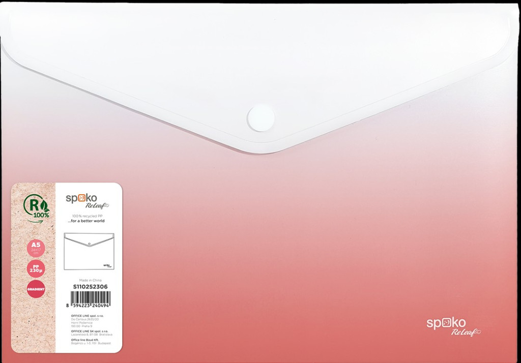 Rendezze dokumentumait a Spoko ReLeaf Gradient kollekcióval, amely egy leheletnyi friss levegőt és az eredetiség színes árnyalatát adja az irodájának! Modern megjelenés, amely dinamikus, elegáns és kifinomult. Az újrahasznosított és tartós PP-ből készült kollekció három árnyalatban kapható.Praktikus irattartó tasak, mely különböző dokumentumok tárolására és hordására alkalmas. A könnyen zárható patent megakadályozza a tartalom elvesztését.