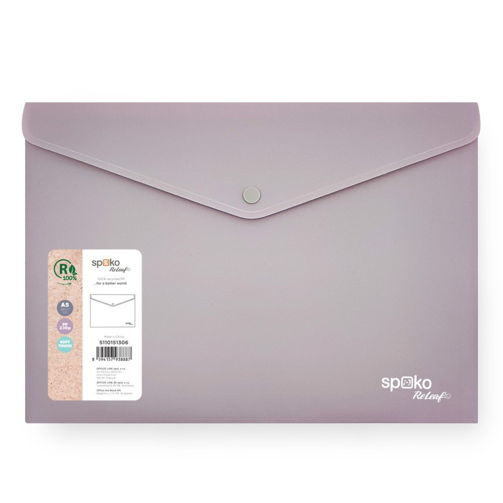 A Spoko ReLeaf a Spoko új, környezettudatos termékcsaládja, mely termékek gyártása során többnyire újrahasznosított anyagokat használnak. A SoftTouch irattartók 100%-ban újrahasznosított PP-ből készülnek. Ennek köszönhetően rendelkeznek a független Global Recycled Standard tanúsítvánnyal is.Praktikus, nem átlátszó irattartó tasak, mely különböző dokumentumok tárolására és hordására alkalmas. A könnyen zárható patent a tasak színével harmonizál.