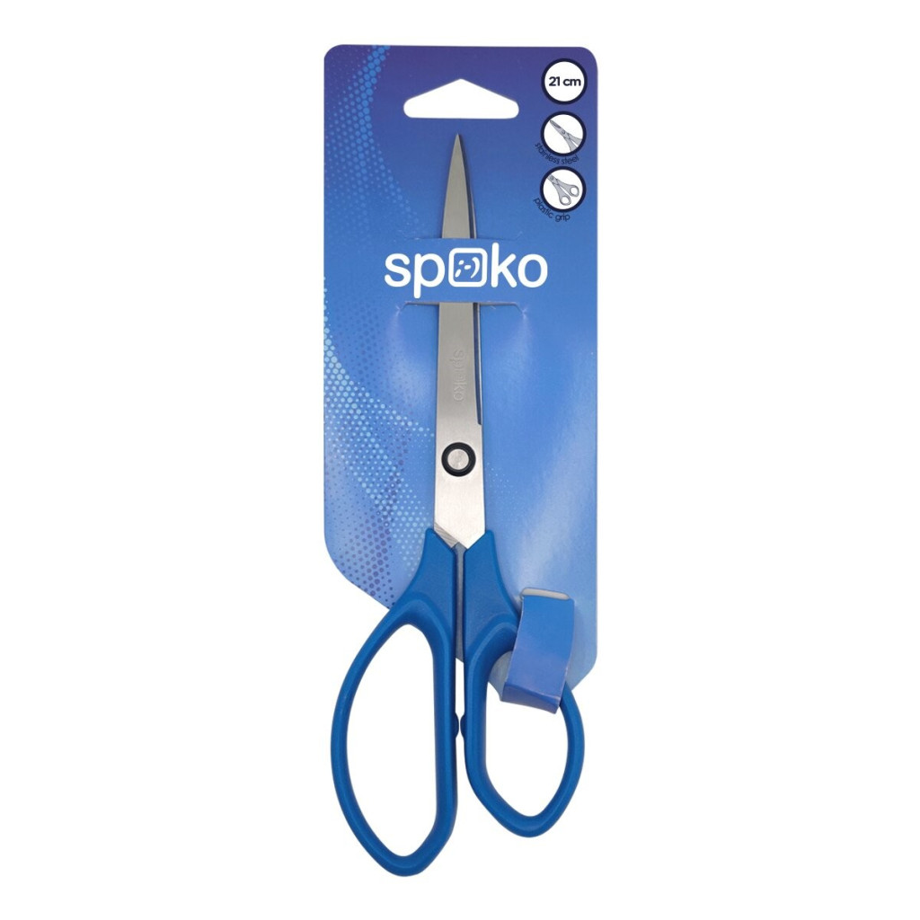 Remekül kidolgozott irodai olló mindennapi használatra. A kényelmes használatot a műanyag, aszimmetrikus fogórész biztosítja. Pengéjén Spoko logó található.
