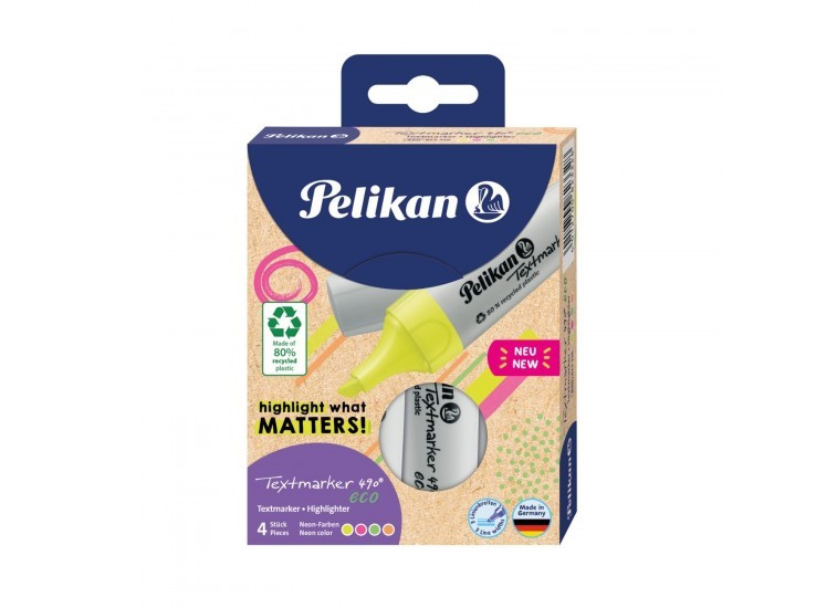Eco szövegkiemelő készlet / 4 szín a gyors és tiszta kiemelésért, kreatív célokra, hosszú eltarthatósággal, 80%-ban újrahasznosított anyagokból. A speciális hegynek köszönhetően három hegyvastagságban használható jelölésre (1, 2 és 5 mm). A tinta jó átlátszósága biztosítja, hogy a megjelölt szöveg jól olvasható marad. Kiszáradás elleni védelemmel: 8 órán keresztül kupak nélkül sem szárad ki. Németországban készült.