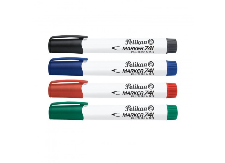 Pelikan 741-es kék, fekete,zöld, és piros színű táblafilc, mely szárazon szinte minden nem porózus felületről letörölhető, lekerekített heggyel, ergonomikus henger testtel, utántölthető, butil acetát mentes, 10 db/doboz.