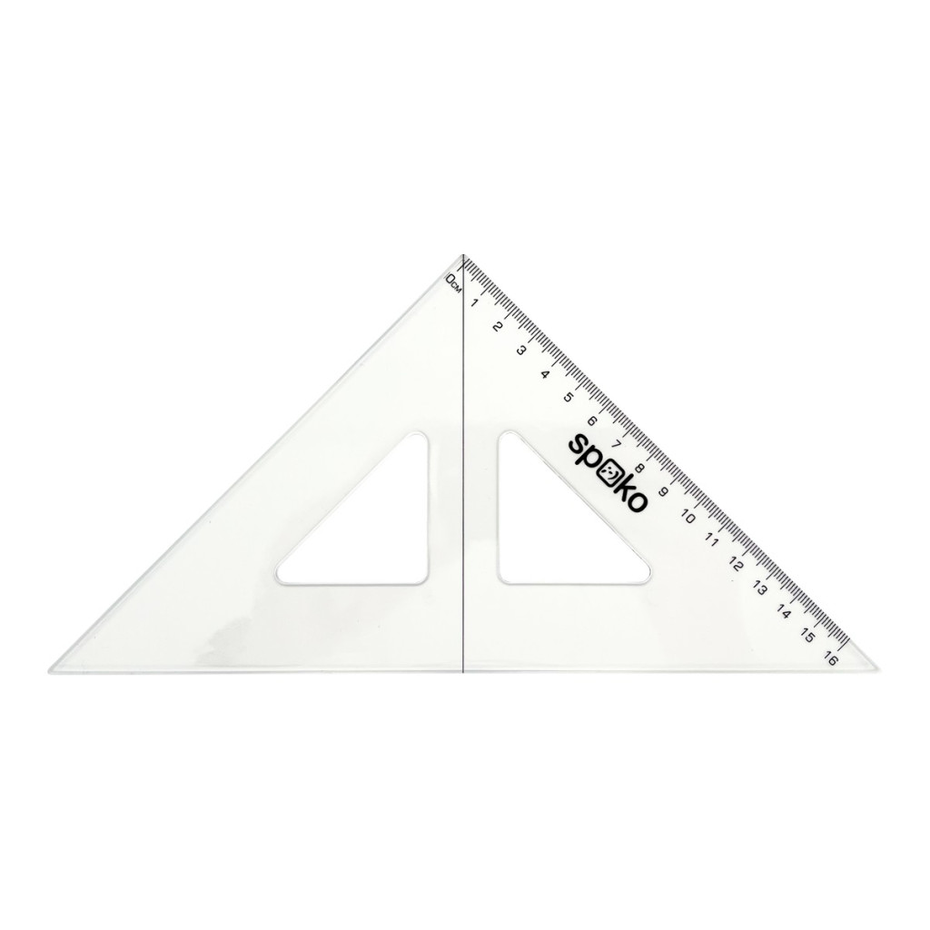 Egyenlő szárú, derékszögű háromszög vonalzóval és előrenyomott 16 cm-es léptékkel. A vonalzó 45°/90°/45° szögeket képez. Csomagolás euro lyukas bliszterben.