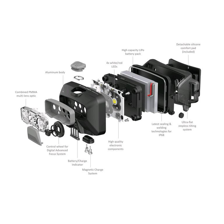 A HF6R Core a Ledlenser intuitív használatú, vékony fejlámpája rendszeres túrázáshoz és igényesebb barkácsprojektekhez. Könnyű és kiváló minőségű alumínium házzal, valamint három fényerősséggel és piros első lámpával rendelkezik. A szabadalmaztatás alatt álló Digital Advanced Focus System látszólag fokozatmentes fókuszálást tesz lehetővé és intuitív módon használható a Focus Wheel segítségével, míg a dönthető lámpafej állítható megvilágítást biztosít. A beépített akkumulátor a mágneses töltőrendszeren keresztül könnyedén feltölthető. További hasznos funkciói közé tartozik a praktikus szállítási zár, valamint az akkumulátor-állapotjelző.